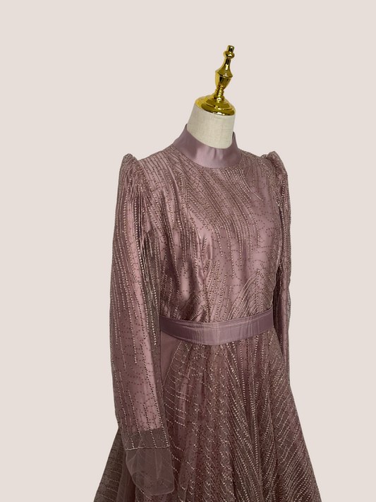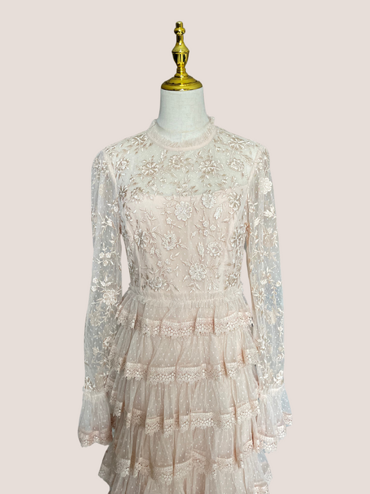 Embroidered Long Sleeve Ruffled Tiered Gown