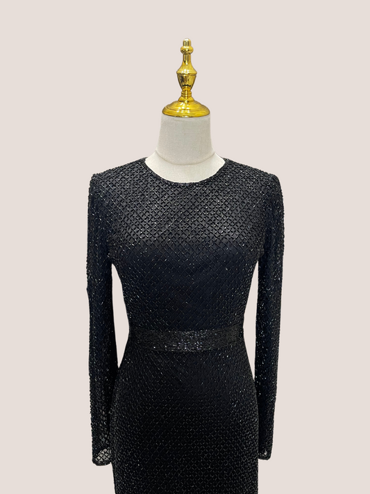 Long Sleeve Lattice Beaded Midi Cocktail Dress
