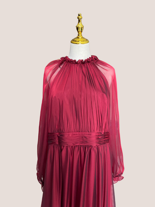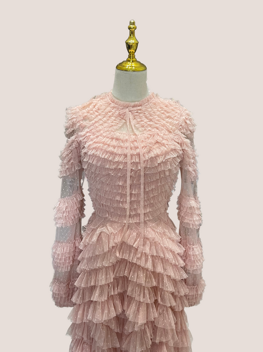 High Neck Puff Long Sleeve Ruffle Tiered Gown