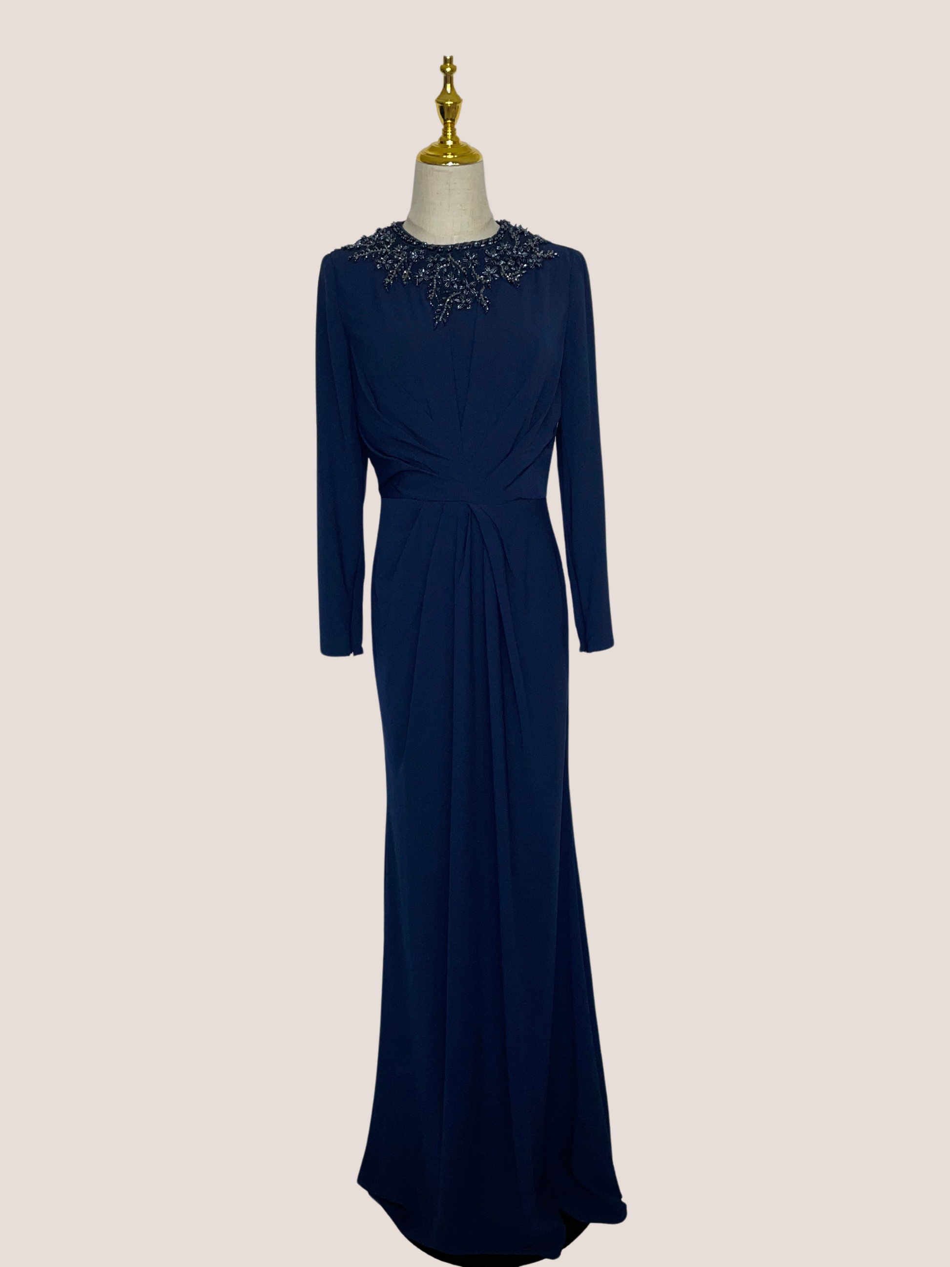 Beaded High Neck Front Twist Long Sleeve Trumpet Gown